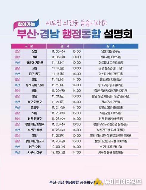 부산시와 '부산․경남 행정통합 공론화위원회'는 행정통합에 대한 시민들의 의견을 듣기 위해 '2025년 부산지역 하반기 현장 설명회'를 개최한다고 밝혔다.