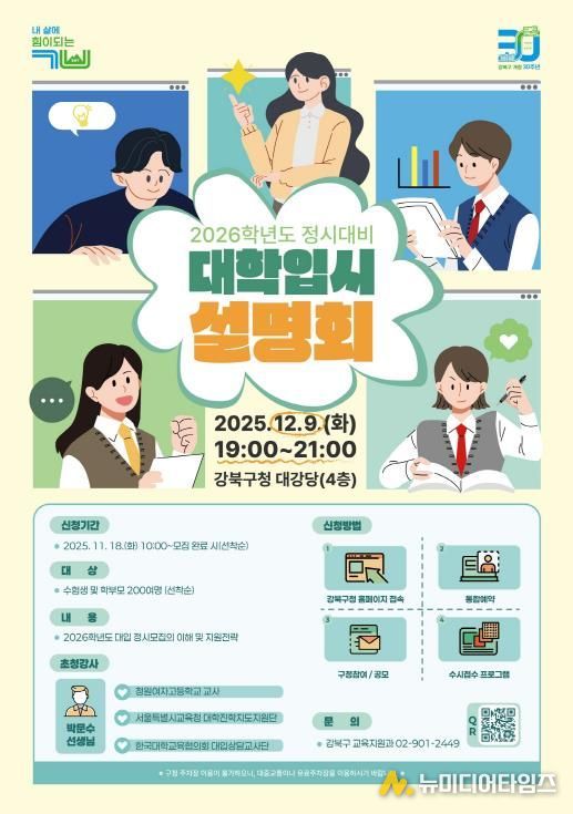서울 강북구는 오는 12월 9일과 13일 강북구청 대강당에서 ‘2026학년도 정시 대비 대학입시 설명회’와 ‘1:1 진로진학 상담’을 연이어 개최한다고 밝혔다.