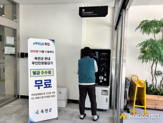 또한 지난 10월 10일부터 개정된 ‘옥천군 제증명 등 수수료 징수 조례’ 시행에 따라 모든 무인민원발급기 수수료를 전면 무료화해 군민 누구나 부담 없이 설치된 무인민원발급기에서 주민등록등본, 가족관계증명서 등 총 123종의 제증명 서류를 무료로 발급받을 수 있다.