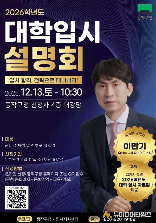 동작구는 2026학년도 대학입시를 준비하는 관내 수험생과 학부모를 대상으로 ‘정시전형 입시설명회’를 개최한다고 밝혔다.