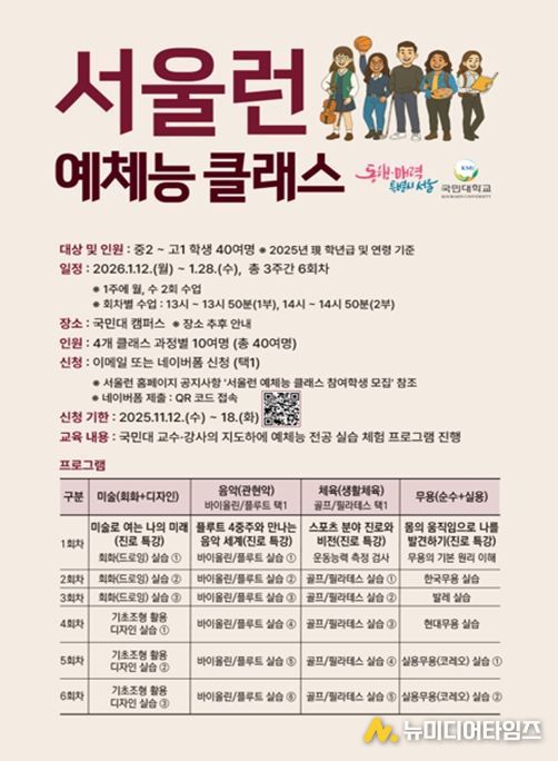 서울시는 국민대학교와 협력해 올 겨울방학부터 ‘서울런 예체능 클래스’ 시범운영에 들어간다고 밝혔다. 참여를 희망하는 중학교 2학년~고등학교 1학년 40명은 11월 12일~11월 18일 서울런 누리집에 공지된 이메일로 접수하면 된다.