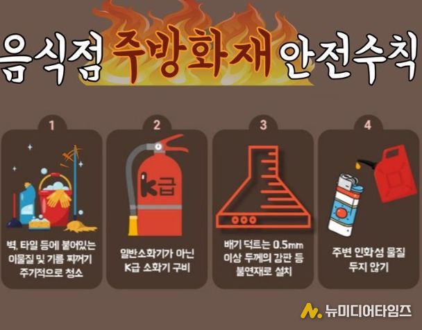 김종욱 천안서북소방서장은 “음식점 주방은 화기 사용이 많고 기름이 쉽게 쌓이는 환경인 만큼, 주기적인 청소와 함께 K급 소화기 비치가 필수”라며 “조리 중 자리를 비우지 않고 주변에 인화성 물질을 두지 않는 등 기본 안전수칙을 준수해 달라”고 당부했다.