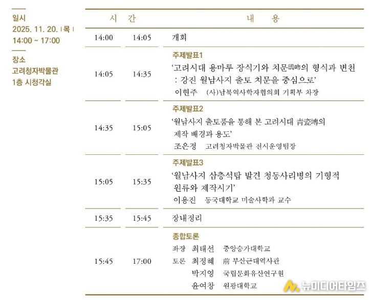 이현주 남북역사학자협의회 차장의 ‘고려시대 용마루 장식기와 치문의 형식과 변천: 강진 월남사지 출토 치문을 중심으로’라는 주제발표를 시작으로 조은정 고려청자박물관 팀장이 ‘월남사지 출토품을 통해 본 고려시대 靑瓷塼의 제작 배경과 용도’이라는 주제로 월남사와 고려청자요지의 연관성에 대한 발표를 이어간다.