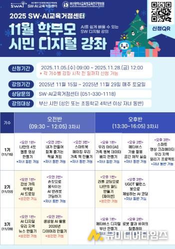 부산광역시교육청교육연구정보원은 오는 15일부터 29일까지 매주 토요일마다 북구 덕천동 소재 SW·AI교육거점센터에서 시민 200여 명을 대상으로 ‘시민 디지털 강좌’를 운영한다.