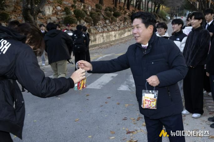 이날 김창규 제천시장, 박영기 제천시의회 의장, 시 관계 공무원들은 이른 아침부터 시험장을 돌며 수험생들에게 따뜻한 격려와 응원을 전했다. 특히 학부모와 지역 주민, 선·후배들이 함께 모여 수험생에게 박수와 응원의 메시지를 보내며 훈훈한 분위기를 더했다.
