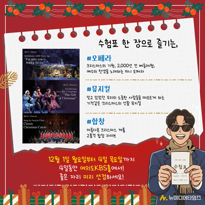 곧 다가올 크리스마스를 맞아 온 가족이 함께 즐길 수 있는 최고의 연말 공연, ‘크리스마스 칸타타’가 수험생들을 위한 특별한 초대 이벤트를 진행한다. 올해 대입 수능을 치른 수험생이라면 누구나 무료로 공연을 관람할 수 있는 파격적인 혜택이다. '크리스마스 칸타타'는 전 세계 40개국 이상에서 사랑받아온 명품 클래식 뮤지컬 형식의 공연으로, 음악과 연극이 어우러진 감동적인 크리스마스 스토리를 3막으로 선보인다.