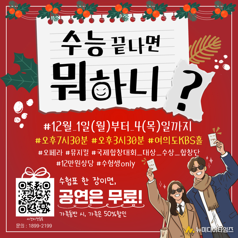 수험생 본인: 수험표 지참시 무료 관람 동반인: 동반 2인까지 50% 할인된 가격으로 티켓 구매 가능 이번 공연은 가족, 친구, 연인과 함께 소중한 연말 추억을 만들 수 있는 절호의 기회다.