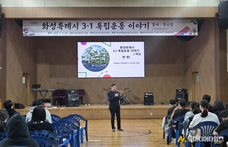 화성특례시에서 3.1 독립운동의 역사적 의미를 되새기는 강연회가 열렸다. 마도면 주민자치회는 13일 오후 1시 화도중학교(교장 남승진) 강당에서 '화성 지역 3.1 독립운동' 주제 강연회를 개최했다고 밝혔다. 화성시 독립기념관 사업소(소장 한동민)가 주관하고 화성특례시·화성시의회·화성문화원이 후원한 이번 행사는 지역에서 잊혀져 가는 독립운동의 역사를 재조명하는 자리로 마련됐다.