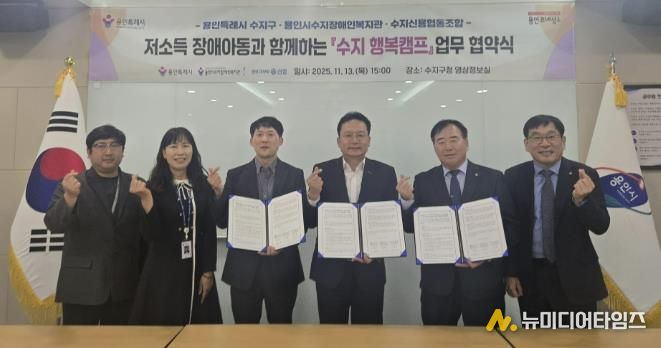 용인특례시 수지구는 13일 용인시수지장애인복지관과 수지신용협동조합과 함께 저소득 장애아동의 복지 향상과 장애 인식 개선을 위한 ‘수지 행복캠프’ 추진 업무협약을 체결했다고 14일 밝혔다.