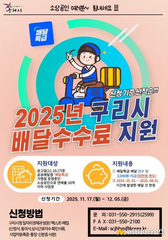 구리시는 '2025년 구리시 소상공인 배달 수수료 지원사업' 참여 신청을 11월 17일부터 12월 5일까지(3주간) 신청받는다고 밝혔다.