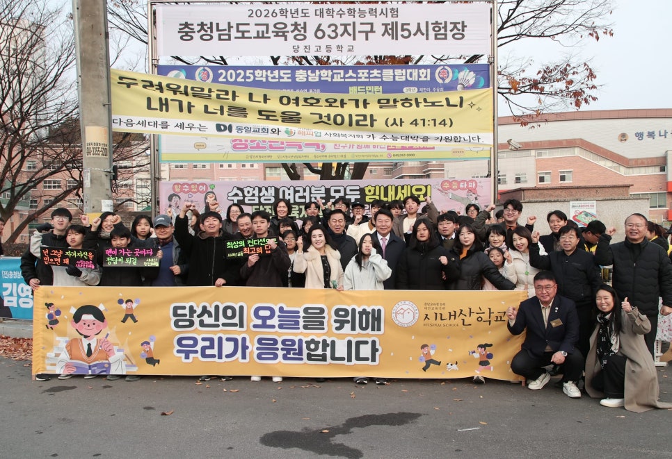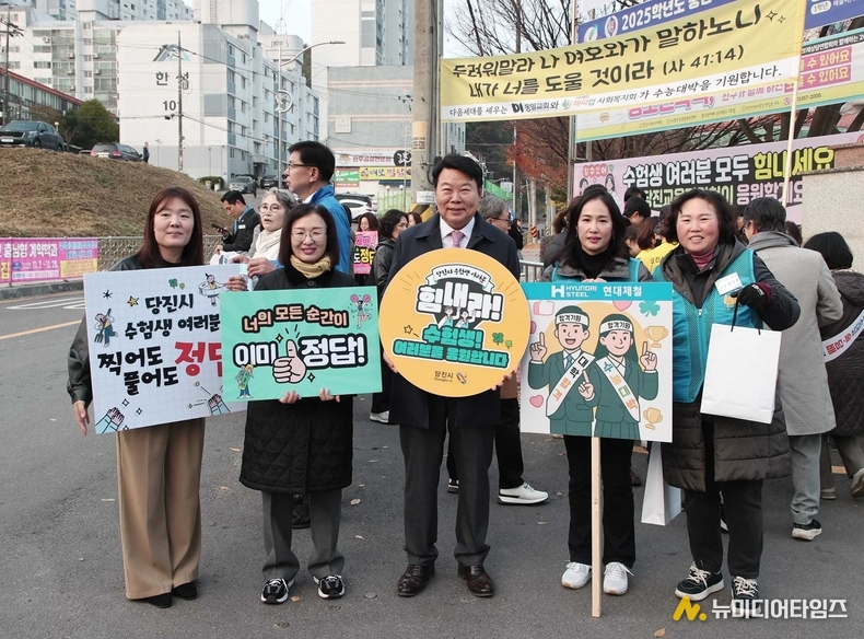 [당진] 11월 13일, 2026학년도 대학수학능력시험(수능)일, 당진시의 주요 인사들이 신평고, 호서고, 당진고 등 3개 고사장을 찾아 수험생들을 위한 뜨거운 응원전을 펼쳤다. 올해 당진에서는 총 1,256명의 수험생이 응시했으며, 전국적으로는 황금 돼지띠(2007년생) 출생률의 영향으로 2019년 이후 가장 많은 응시생이 몰린 해로 기록되었다.