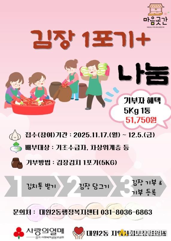 오산시 대원2동지역사회보장협의체는 '2025년 김장 1포기+ 나눔행사'를 오는 17일부터 12월 5일까지 3주간 진행한다고 밝혔다.