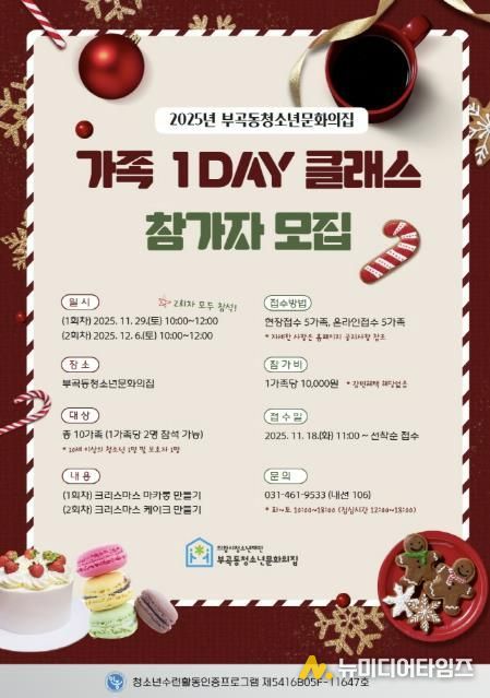 참가 신청은 11월 18일 오전 11시부터 부곡동청소년문화의집 현장 방문 또는 기관 홈페이지를 통해 선착순으로 진행되며, 체험비는 한 가족당 10,000원이다. 기타 프로그램에 관한 자세한 사항은 부곡동청소년문화의집 홈페이지 공지사항을 확인하면 된다.