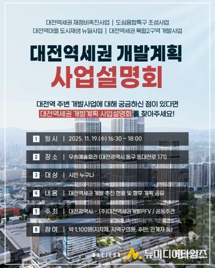 이번 설명회는 대전시와 ㈜대전역세권개발PFV 공동주관으로 개최되며, 대전역세권 개발계획의 주요 내용과 추진 현황, 향후 일정 등을 주민들에게 공유하고 원도심의 미래 비전을 소개하는 시간으로 진행될 예정이다.