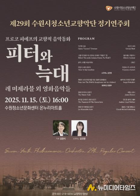 수원시청소년청년재단 수원청소년문화센터에서는 오는 11월 15일 오후4시, 온누리아트홀에서 제29회 정기연주회를 개최한다. 이번 연주회는 ‘프로코 피에프의 교향적 음악동화 '피터와 늑대'’를 중심으로, 세대를 아우르는 감동의 영화음악을 함께 선보이며 청소년 단원들의 풍성한 음악적 성장을 보여줄 예정이다.