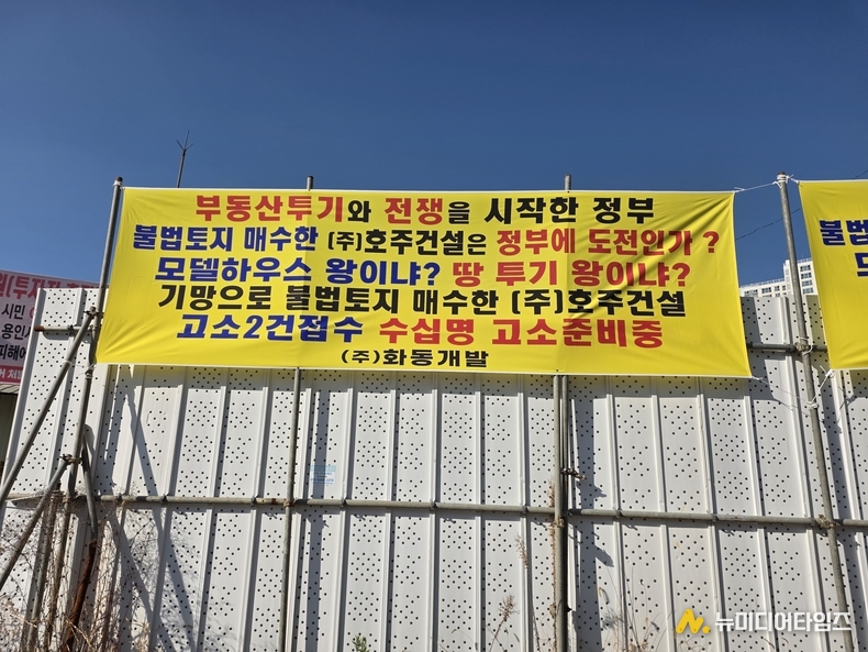 (주)화동개발은 이미 H건설 실질 소유주 A모 이사와 그의 아들을 상대로 허위 시행권 주장, 토지 매집, 허위 민원 제출, 행정절차 개입, 야간 현수막 철거 및 무단침입 등의 혐의로 고소한 상태다. 최근에는 현수막이 야간에 철거됐다는 의혹까지 제기되면서 집회방해·재물손괴 등 고소 건수도 추가됐다. 해당 의혹과 관련해 본지는 H건설 측 입장을 듣기 위해 수차례 연락을 시도했으나 연락이 닿지 않았다.