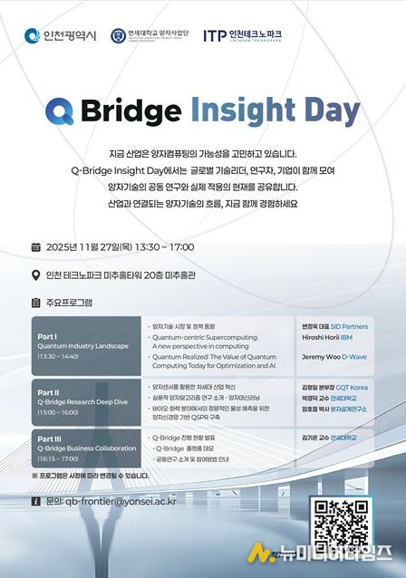 인천광역시는 오는 11월 27일 인천테크노파크 미추홀타워에서 연세대학교 양자사업단, 인천테크노파크와 공동 주관으로 ‘Q-Bridge Insight Day’를 개최했다고 밝혔다.