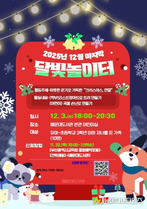 노장석 해운대도서관장은 “가족이 함께 책을 읽고 대화하며 따뜻한 마음을 나누는 시간을 통해, 한 해를 포근하게 마무리하길 바란다”라고 전했다.