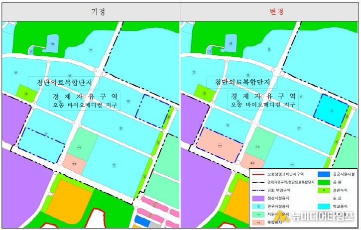 충북도는 11월 17일 오송첨단의료복합단지의 토지이용계획을 변경하는 개발실시계획이 승인됐다고 밝혔다. 이를 통해 오송읍 연제리 682-2, 682-3은 연구시설용지에서 복합용지로, 연제리 657은 연구시설용지에서 학교시설용지로 변경된다.