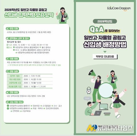 대전시교육청은 2026학년도 대전시 일반고 및 자율형 공립고 신입생 선발·배정 절차를 쉽게 이해할 수 있도록 제작한 '2026학년도 일반고·자율형 공립고 신입생 배정방법 안내 리플렛'을 지난달과 이달에 걸쳐 관내 모든 중학교 학부모에게 배부했다고 밝혔다.