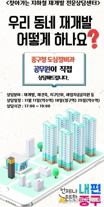 서울 중구가 퇴근길에 재개발 관련 궁금증을 손쉽게 해결할 수 있는 ‘찾아가는 지하철역 재개발 전문상담코너’를 청구역과 약수역 역사 내에서 운영해 큰 호응을 얻고 있다.