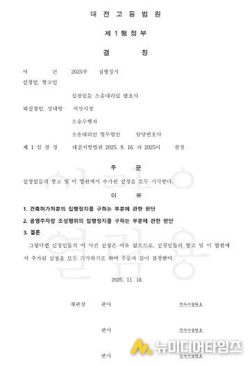 충남 서산시가 추진하는 예천지구 공영주차장(초록광장) 조성사업과 관련하여 일부 시민이 제기한 건축허가처분 집행정지 항고에 대해 대전고등법원이 18일 기각 결정을 내렸다.