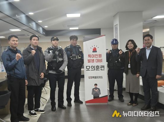 강원특별자치도는 지난 11월 18일 오후 5시 30분, 도청 종합민원실에서 청원경찰, 춘천경찰서, 보안업체와 함께 ‘폭언·폭행 등 특이민원 대응 모의훈련’을 실시했다.
