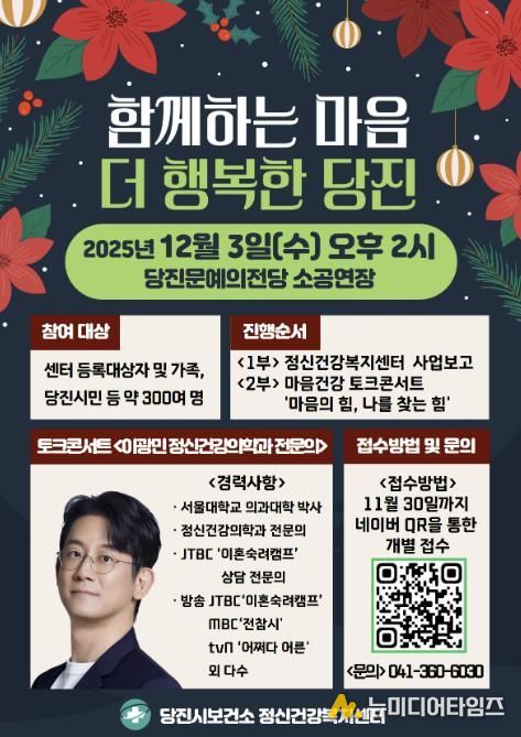 당진시보건소는 오는 12월 3일 오후 2시 당진문예의전당 소공연장에서 2025년 정신건강복지센터 사업 보고회 및 마음건강 토크콘서트를 개최한다고 20일 밝혔다.