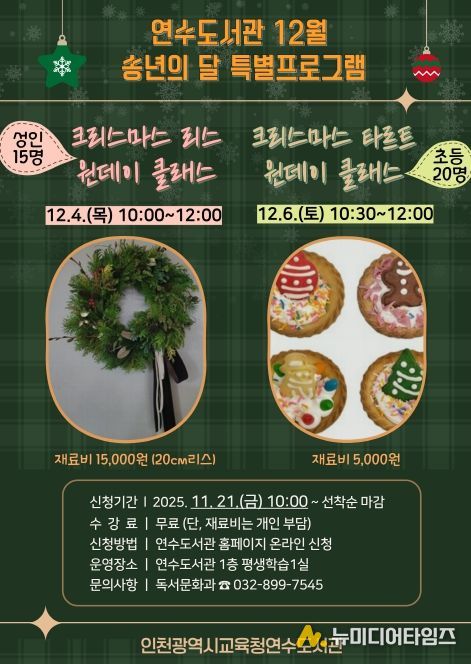 인천광역시교육청연수도서관은 12월 4일부터 6일까지 지역 주민을 위한 ‘12월 송년의 달 특별프로그램’을 운영한다.