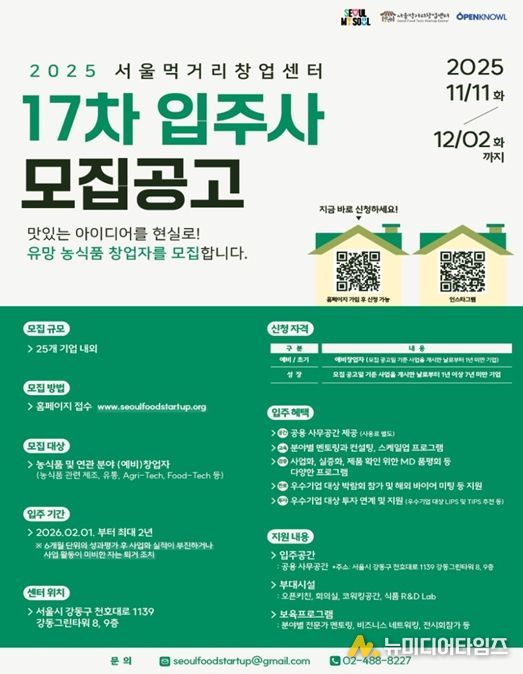 서울시는 전 세계적으로 확산 중인 K-푸드 열풍 속에서 농식품 분야 유망 스타트업의 성장을 본격 지원하기 위해 ‘서울먹거리창업센터’ 신규 입주기업을 12월 2일까지 공개 모집한다고 밝혔다.