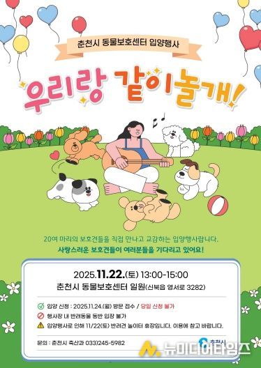 춘천시가 22일 오후 1시 춘천시 동물보호센터에서 유기견 입양행사 ‘우리랑 같이 놀개’를 연다. 이번 행사는 입양을 희망하는 시민이 보호견을 직접 만나보고 교감할 수 있도록 마련한 자리다.