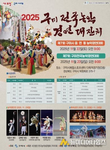 구미시는 11월 22일부터 23일까지 구미시복합스포츠센터 다목적강당에서 '2025 제7회 구미전국농악경연대잔치'를 연다. 이번 대회는 (사)한국농악보존협회 구미지회(지회장 박정철)가 주관하며, 전국 각지의 농악단과 명인들이 참여하는 대표적인 전통예술 경연으로 자리 잡았다.