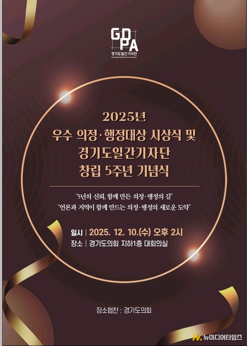 '2025년도 우수의정·행정대상 시상식'은 오는 12월 10일(수) 14시, 경기도의회 대회의실에서 개최될 예정이다.