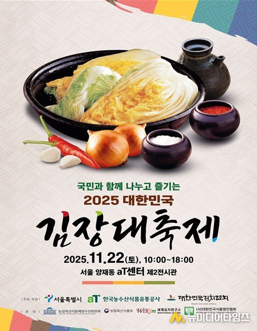 서울시는 한국농수산식품유통공사, (사)대한민국김치협회와 22일 10시부터 18시까지 양재동 aT센터 제2전시장(3층)에서 ‘2025 대한민국 김장대축제’를 개최한다.
