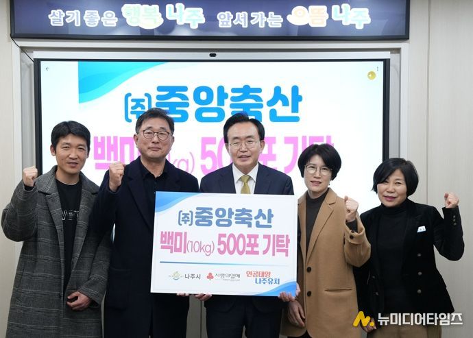 나주시(시장 윤병태)는 지난 20일 ㈜중앙축산(대표 신동규)이 10kg 백미 500포를 기탁했다고 21일 밝혔다.