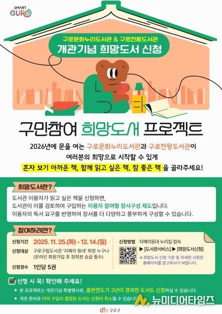 구로구가 오는 25일부터 다음 달 14일까지 내년 개관 예정인 구로문화누리도서관과 구로천왕도서관에서 ‘희망도서 프로젝트’를 추진한다고 밝혔다.