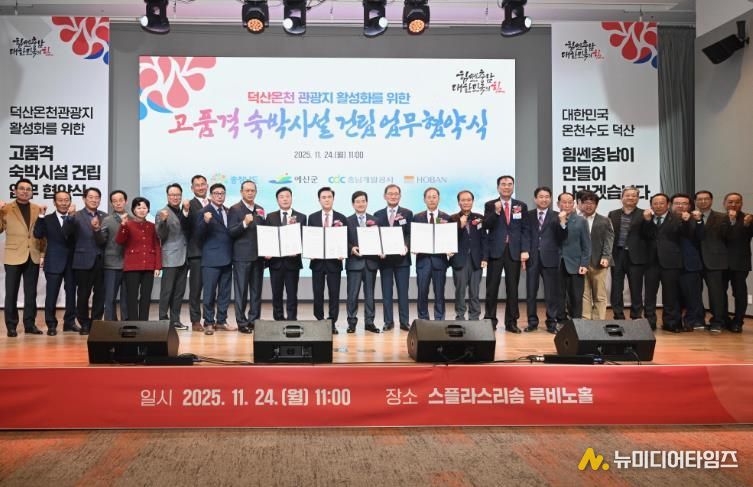 예산군은 24일 충청남도, 충남개발공사, ㈜호반호텔앤리조트와 함께 덕산온천관광지에 고품격 숙박시설 및 컨벤션 기능을 갖춘 복합 휴양시설 건립을 위한 업무협약(MOU)을 체결했다.