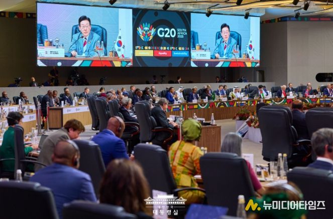남아프리카공화국을 방문한 이재명 대통령은 22일(현지시간) 오전 주요 20개국(G20) 정상회의 제1세션에 참석해 전 세계적으로 복합적인 경제 위기에 직면한 가운데 격차와 불균형 심화에 대한 우려를 표하고 이를 완화하기 위한 세 가지 해법을 제시했다.