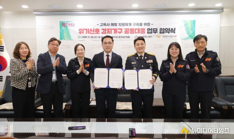대전 동구는 26일 구청장 접견실에서 대전 동부소방서(서장 이준서)와 ‘위기신호 감지가구 공동대응’ 업무협약을 체결했다고 밝혔다.