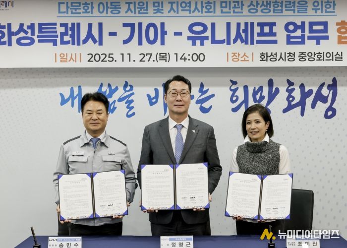 화성특례시가 27일 시청 중앙회의실에서 유니세프 한국위원회, 기아 주식회사와 ‘다문화아동 지원 및 지역사회 민관 상생 협력을 위한 업무협약’을 체결했다.