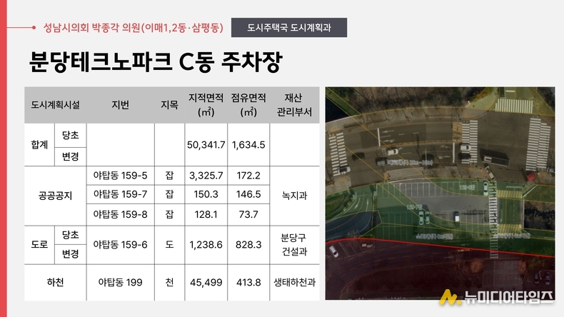 박 의원은 야탑동 분당테크노파크 C동 부지 문제도 함께 언급했다. 이 부지는 1996년 성남시가 복개한 하천 위에 조성돼 20년 넘게 주차장으로 사용돼 왔으나, 도시계획상 '주차장'으로 지정되어 있지 않은 상황이다.