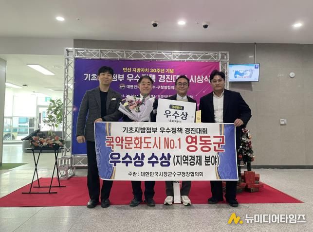 충북 영동군은 지난 26일 보령머드테마파크 컨벤션홀에서 열린 대한민국시장군수구청장협의회 ‘2025 기초지방정부 우수정책 경진대회’에서 지역경제 활성화 분야 우수상을 받았다.