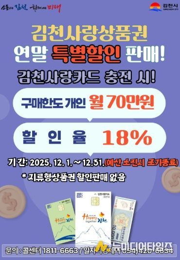 김천시는 오는 12월 한 달 동안 김천사랑상품권을 18% 특별 할인 판매한다고 28일 밝혔다.