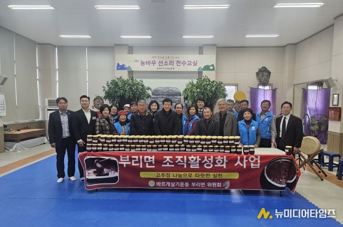 금산군 부리면바르게살기운동위원회(위원장 양원식)는 지난 27일 평촌리 농바우끄시기전수관에서 회원 30여 명이 참여한 가운데 지역 내 소외계층을 위한 이웃사랑 고추장 담그기 봉사를 진행했다.