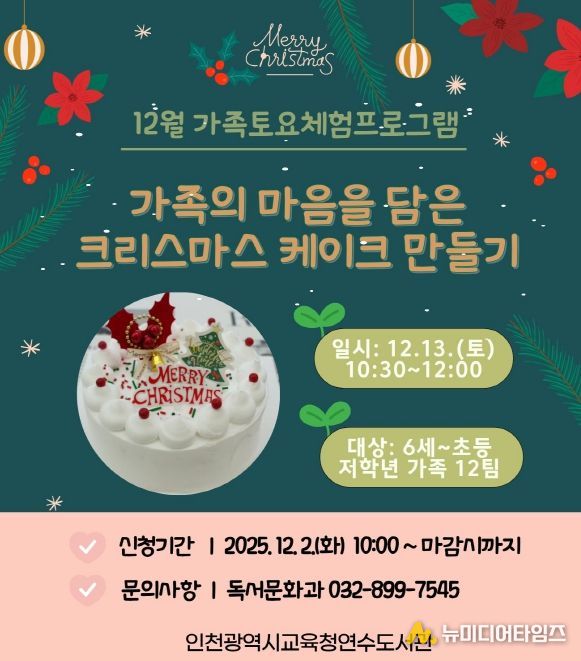 이번 프로그램은 6세부터 초등 저학년 자녀와 부모가 함께 크리스마스 케이크를 만드는 체험 강좌로, 크림 데코레이션과 토핑 꾸미기 등 기초 베이킹 활동을 진행한다.