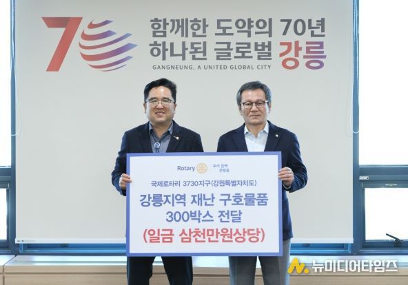 국제로타리 3730지구(총재 홍성희)는 1일(월) 국제로타리 3730지구 3지역(대표 김영호) 회장단과 함께 시청 8층 시민사랑방에서 강릉지역 재난 구호물품 300박스(3천만 원 상당)를 강릉시(시장 김홍규)와 강릉시자원봉사센터(센터장 김선정)에 전달했다.