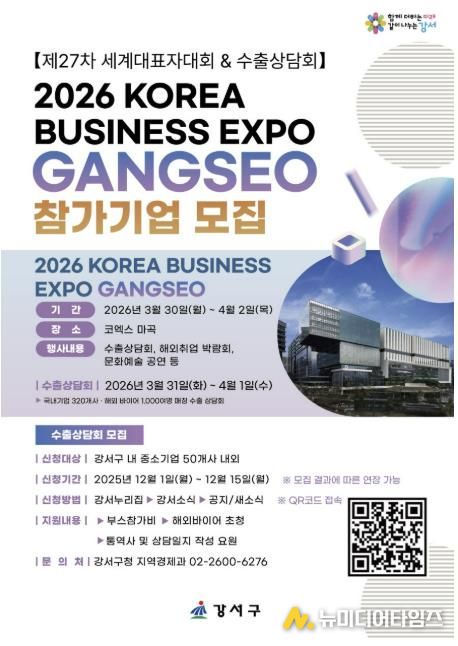 서울 강서구가 내년 3월 코엑스마곡(마곡중앙로 143)에서 열리는 ‘2026 한국 비즈니스 엑스포 강서’ 전시·수출상담회에 참여할 지역 중소기업 50여 곳을 모집한다. 신청 기간은 12월 15일까지다.