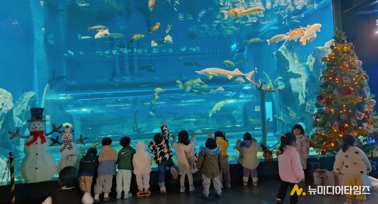 충북아쿠아리움의 주요 전시 공간인 메인 수조 앞에는 크리스마스트리와 눈사람 장식이 설치되어 겨울철의 따뜻하고 환상적인 분위기를 한층 더하고 있다. 여기에 메인 수조 속을 유영하는 철갑상어, 무태장어, 비단잉어 등 다양한 민물고기의 모습이 어우러지며, ‘물속에서 즐기는 크리스마스’ 포토존이 완성된다.