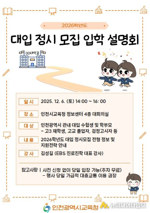 인천광역시교육감은 12월 6일 관내 대입 수험생과 학부모를 대상으로 2026학년도 대입 정시모집 입학설명회를 실시한다.