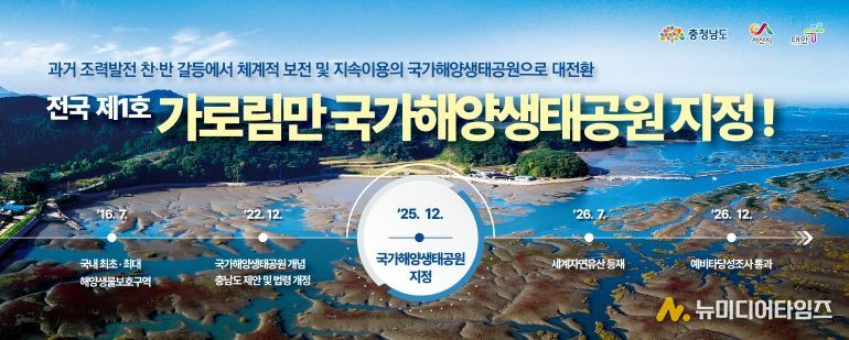 전상욱 도 해양수산국장은 “이번 제1호 국가해양생태공원 지정은 10여 년 간 도민과 지역 정치권, 전문가 등 모두가 함께 추진해 온 결과”라며 “지정 예정구역인 보령갯벌도 전세계가 주목하는 해양생태거점으로 조성하는데 최선을 다하겠다”고 말했다.